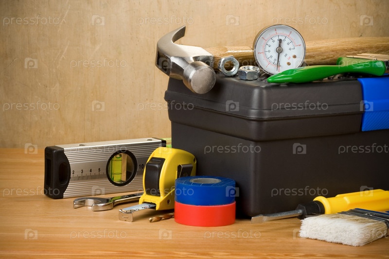 Инструменты и коробка инструментов на дереве