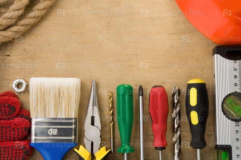 Строительные инструменты на деревянном фоне