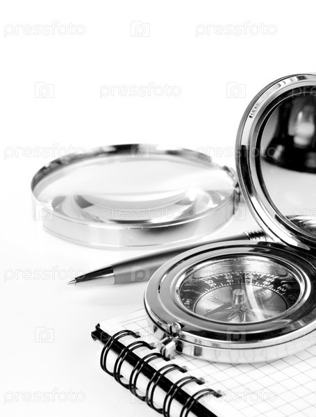 Компас и ручка в ноутбуке, изолированном на белом