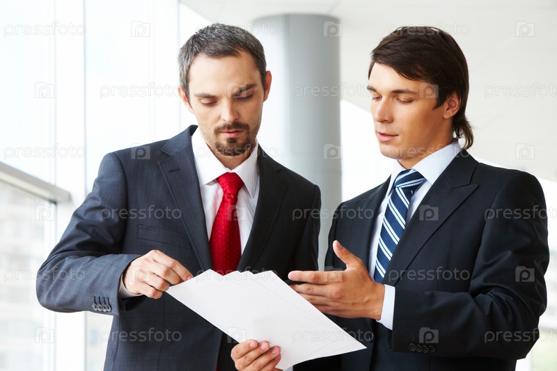 Изображение уверенного бизнесмена, который смотрит на документ в партнере
