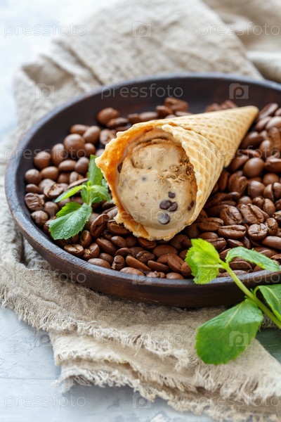 Кофейное мороженое с шоколадными каплями в конусе вафли