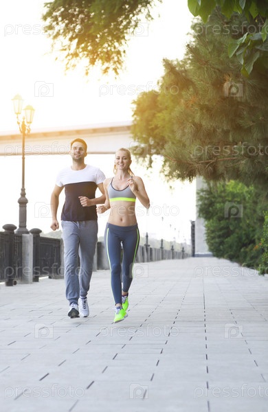 Пара бегает на улице, бегуны тренируются на открытом воздухе и работают в парке