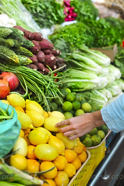 Женщина выбирает фрукты на овощном рынке