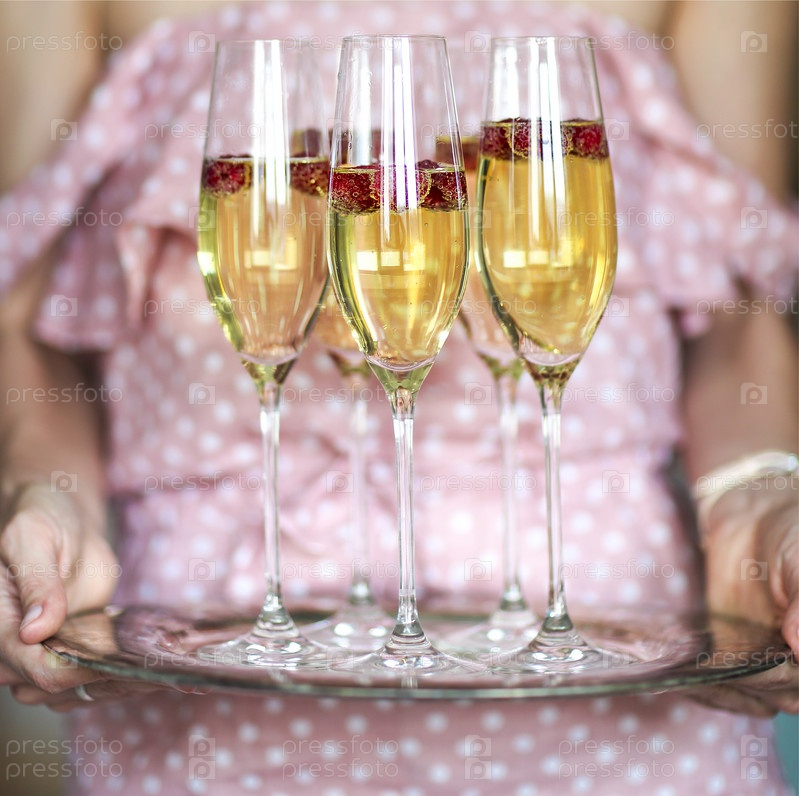 Молодая женщина со стаканами шампанского на подносе