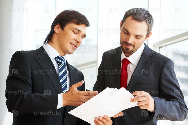 Изображение уверенного бизнесмена, который смотрит на документ в партнере