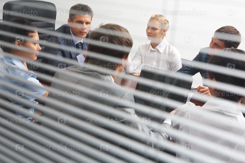 Вид сзади венецианского слепого окна на сотрудников, взаимодействующих на рабочей встрече
