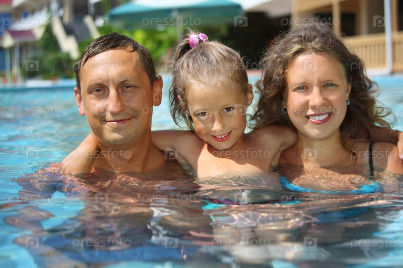 Счастливая семья с дочкой в бассейне