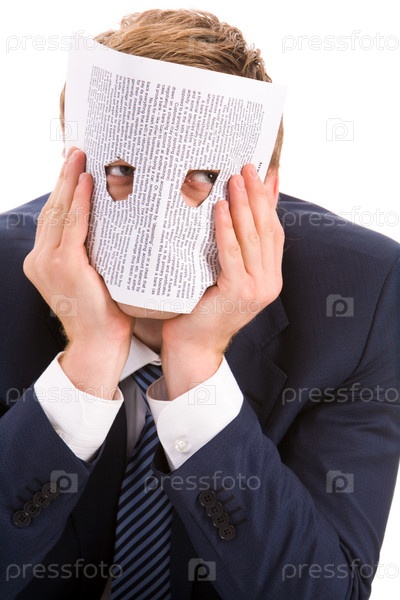Портрет бизнесмена, смотрящего на камеру через две дыры в бумаге