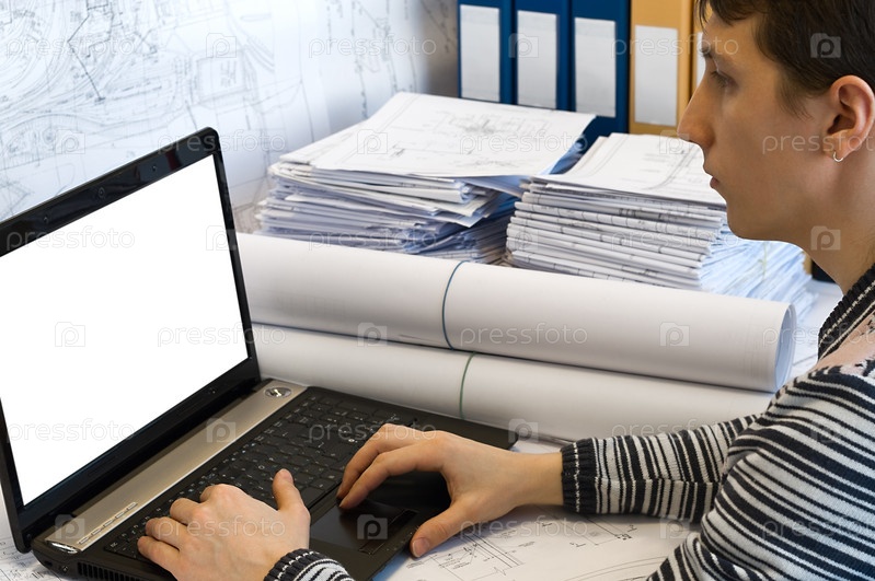 Мужчина с ноутбуком и стопками бумаг за рабочим местом