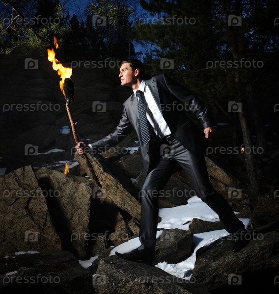 Изображение элегантного мужчины, держащего горящую палку во время движения в темноте