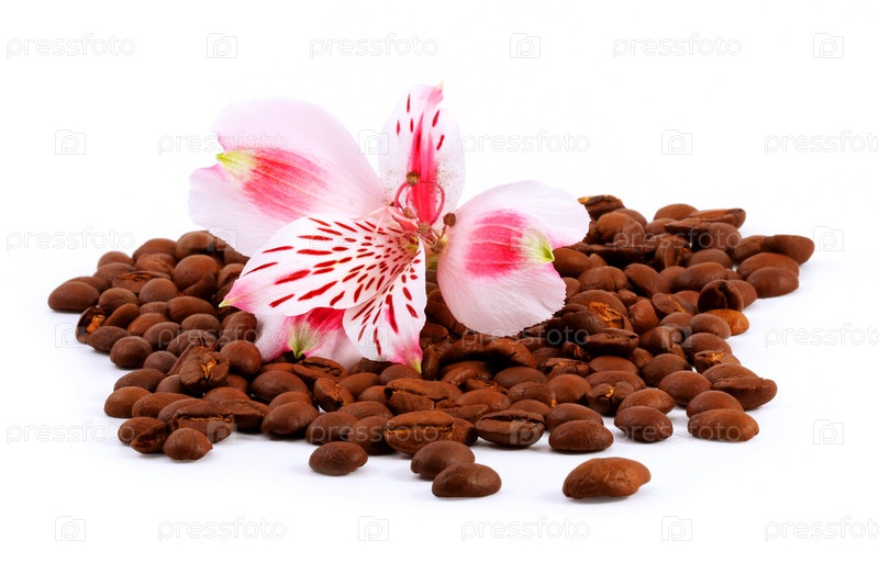 Зерна кофе и розовый цветок на белом фоне