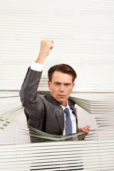 Портрет разгневанного мужчины, смотрящего на камеру из венецианского слепого и показывающего кулак