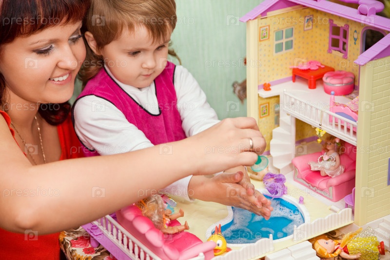 Женщина с девочкой играют в куклы