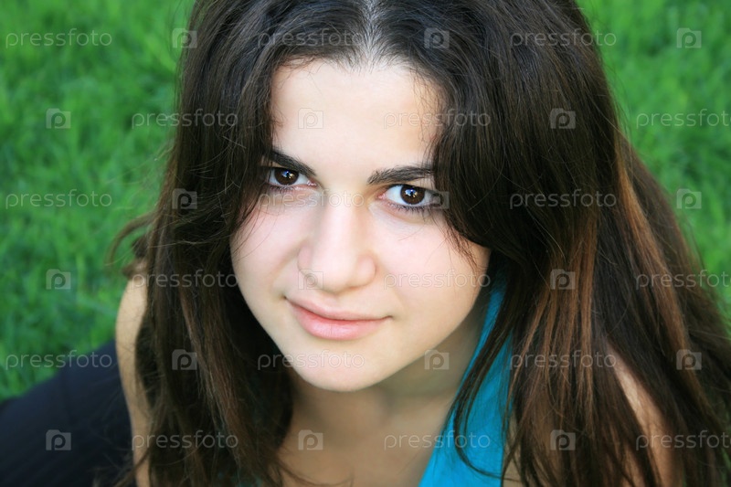 Портрет симпатичной брюнетки на фоне зеленой травы