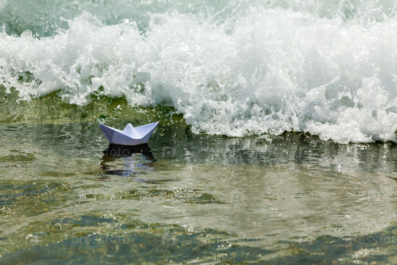 Бумажный кораблик в морских волнах