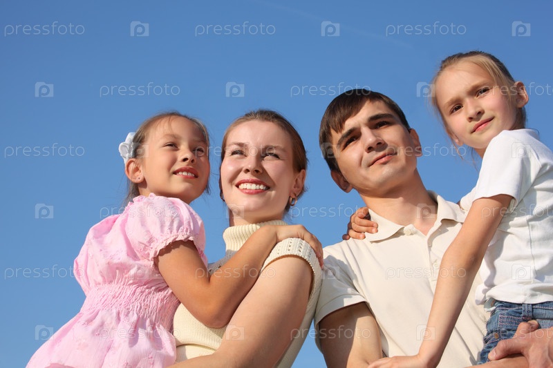 Семья из четырех человек на фоне голубого неба