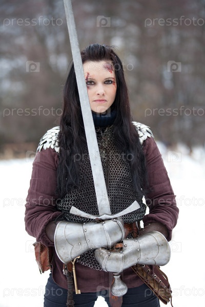 Красивая молодая женщина в средневековой одежде с мечом