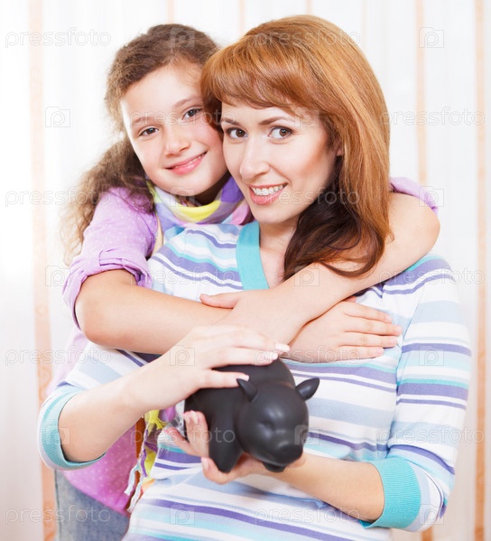 Девочка и ее мать с копилкой экономят деньги