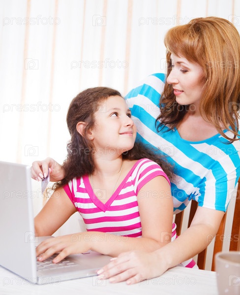 Молодая женщина с дочерью используют ноутбук