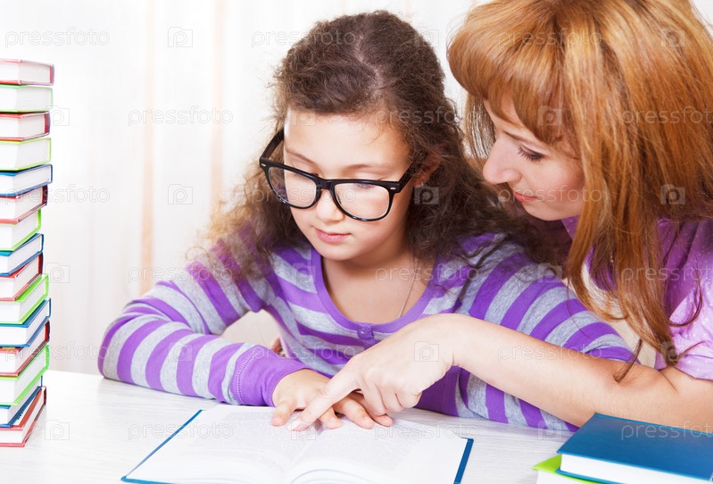 Девочка читает с матерью