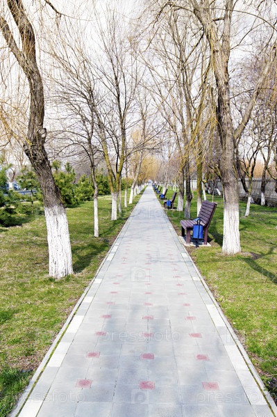 Весенняя липовая аллея со скамейками для отдыха в лучах солнца