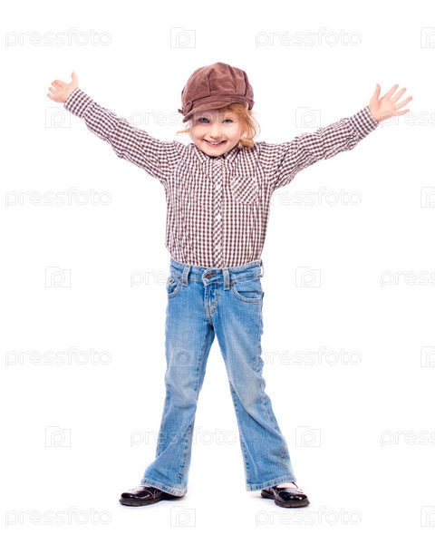 Смешная девчонка в кепке в полный рост на белом