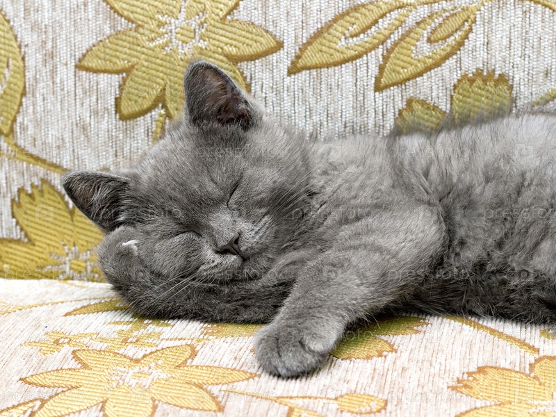 Дымчатый британский котенок спит на диване