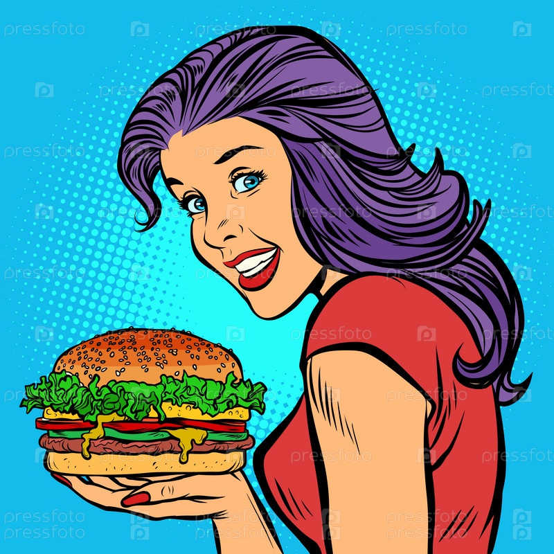 Бургер с сыром, мясной салат на гриле.Голодная женщина ест фастфуд