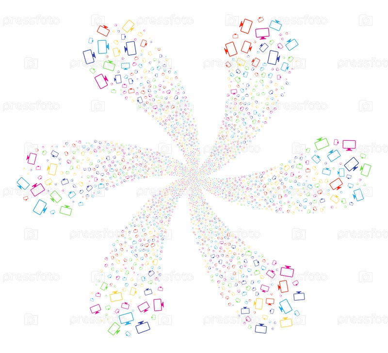 Многоцветный Monitor циклонический фейерверк. внушительный цветок с шестью лепестками, организованные из символов дисплея монитора. стиль векторной иллюстрации - плоские знаковые символы