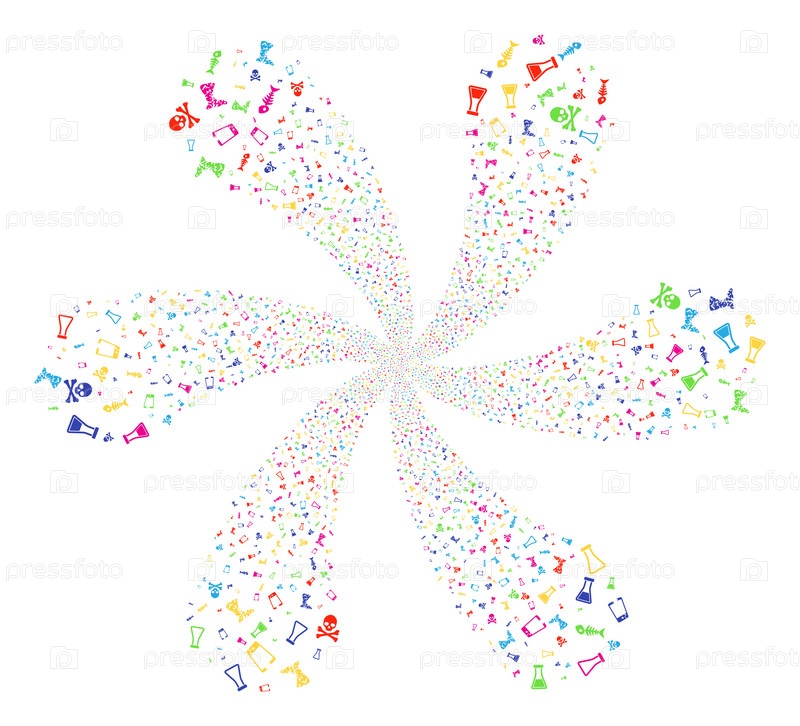 Цветное циклоническое движение токсичного мусора. Впечатляющий поворот, сделанный от рассеивания объектов токсического мусора. Стиль векторной иллюстрации - плоские знаковые символы