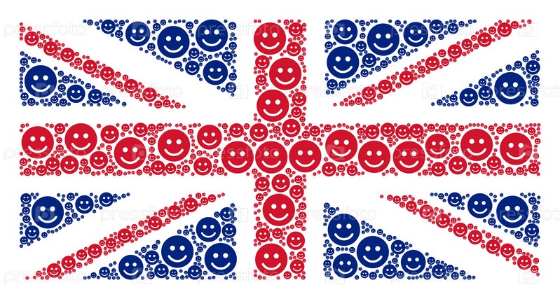 Концепция флага Великобритании выполнена из пиктограмм с радостной улыбкой.Векторные элементы дизайна счастливой улыбки организованы в мозаичный шаблон британского флага