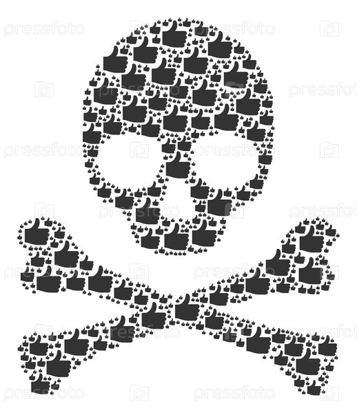 Концепция черепа построена из пиктограмм с поднятым большим пальцем.Векторные предметы с поднятым большой палец объединены в мозаичную композицию ужасов