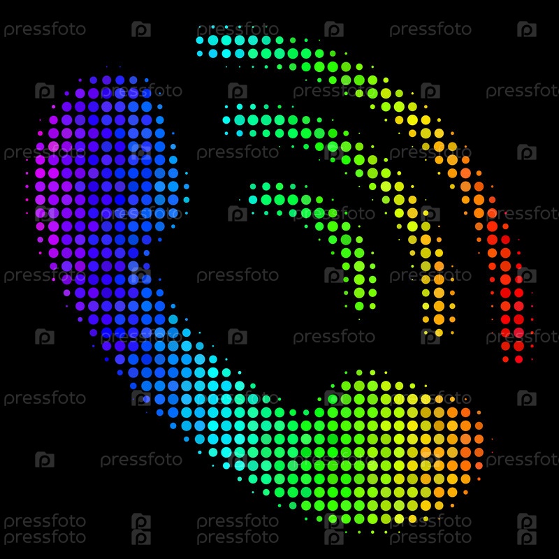 Дот впечатляющий полутонный символ кольца вызова с использованием цветных оттенков радуги с горизонтальным градиентом на черном фоне. Красочная векторная мозаика символа кольца вызова, разработанная со сферическими частицами