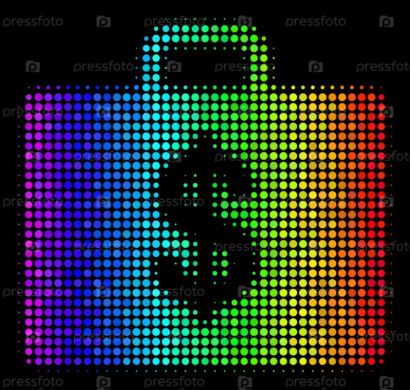 Конечная яркая половинка икона бизнес-дела в цветовых вариациях спектра с горизонтальным градиентом на черном фоне. Цветный векторный рисунок пиктограммы делового дела, разработанная из круговых частиц