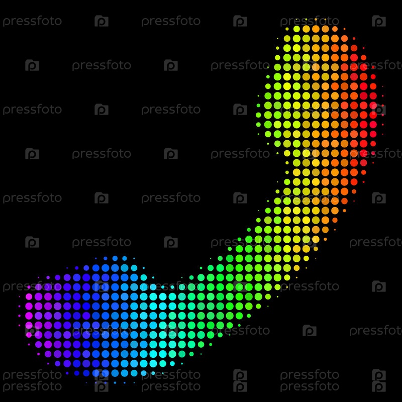 Пиксельные цветные полутонные иконы вызова в цветовых тонах спектра с горизонтальным градиентом на черном фоне.Красоватый векторный рисунок пиктограммы звонка, образованной из элементов круга