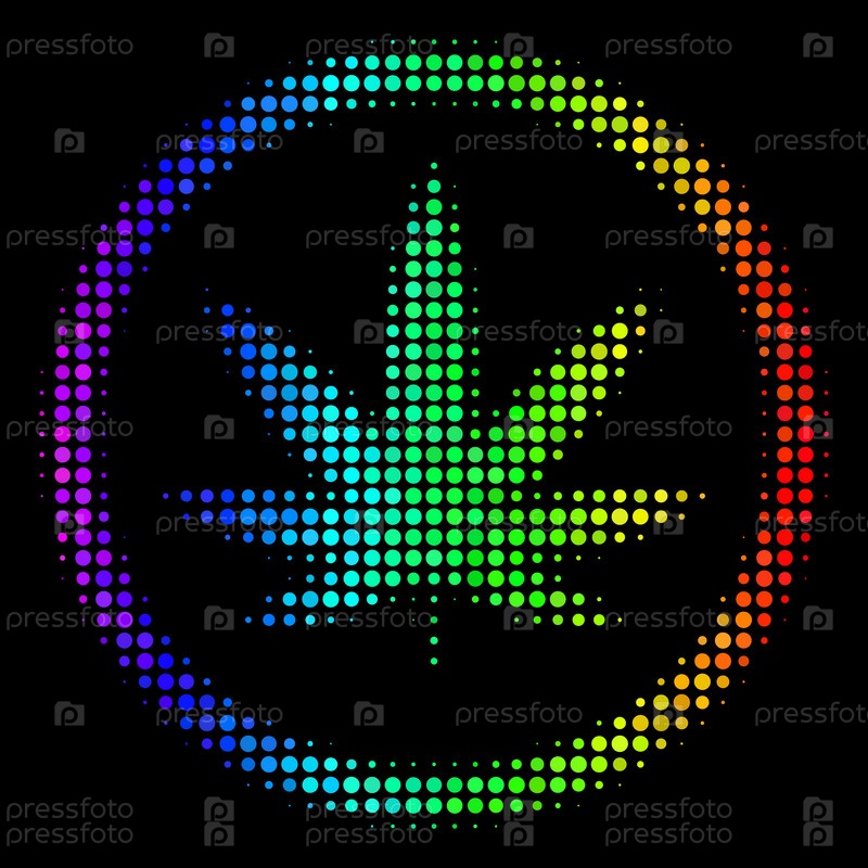 Пиксельные яркие полутонные иконы каннабиса с использованием цветных оттенков радуги с горизонтальным градиентом на черном фоне. Цветной векторный состав символа конопли, образованного из сферических элементов