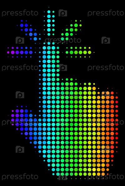 Яркий пиксельный полутон клик-икона с использованием цветовых вариаций радуги с горизонтальным градиентом на черном фоне.Красовая векторная композиция иллюстрации клика, выполненной из круглых клеток