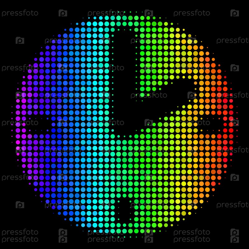 Пикселированный красочный иконка часов полутон в спектральных цветовых вариациях с горизонтальным градиентом на черном фоне. яркая векторная композиция пиктограммы часа, организованной сферическими элементами
