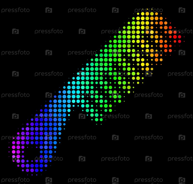 Пиксельный впечатляющий иконка полутонной расчески с использованием спектральных цветовых оттенков с горизонтальным градиентом на черном фоне. Цветный векторный рисунок символа расчески, созданный с помощью элементов круга