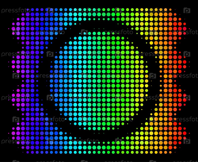 Икона пакета презервативов в ярком полутонном тоне с использованием спектральных цветовых вариаций с горизонтальным градиентом на черном фоне.Многоцветная векторная мозаика символа упаковки презерватива, выполненная из круговых частиц