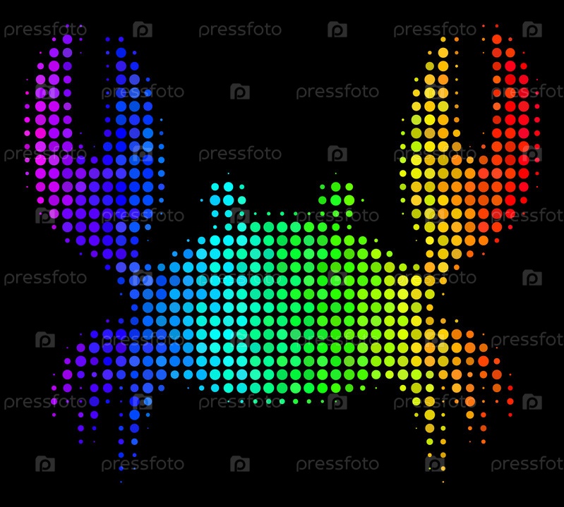 Пиксельные цветные полутонные иконы крабов с использованием цветовых оттенков радуги с горизонтальным градиентом на черном фоне. Цветовая векторная мозаика символа краба, выполненная из круглых предметов