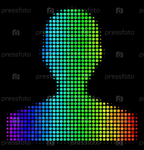 Пикселированный впечатляющий полутон клиентский икон, нарисованный спектральными цветовыми оттенками с горизонтальным градиентом на черном фоне. Яркий векторный коллаж пиктограммы клиента в сочетании с круговыми точками