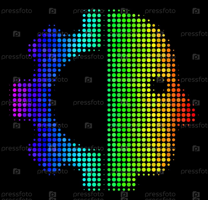 Икона киборговой головы с яркими точками полутонна, нарисованная цветовыми вариациями спектра с горизонтальным градиентом на черном фоне