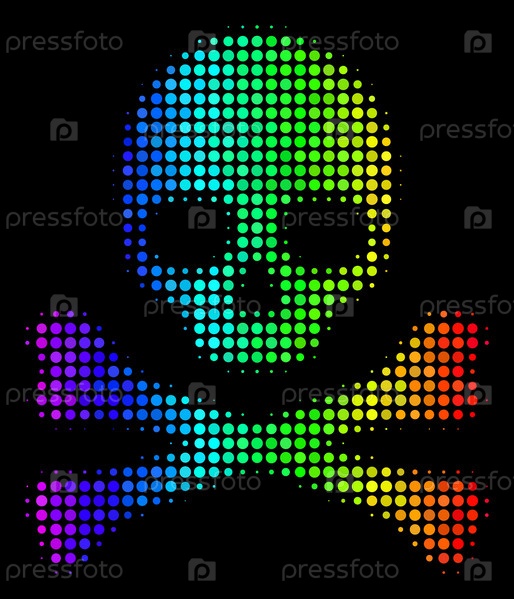 Пиксельные яркие полутонные иконы черепа смерти, нарисованные с спектром цветовых оттенков с горизонтальным градиентом на черном фоне