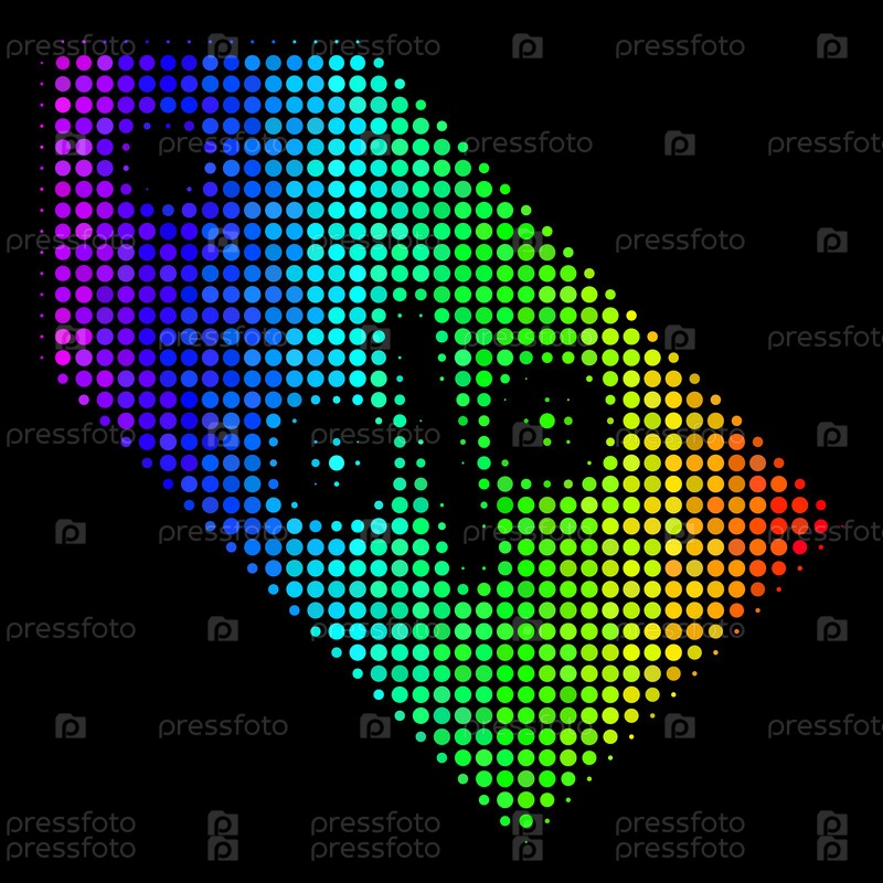 Пятнистый яркий иконка дисконтного тега полутон, нарисованная с спектральными цветовыми вариациями с горизонтальным градиентом на черном фоне.Красоцветный векторный коллаж пиктограммы дисконтной метки из круглых пикселей