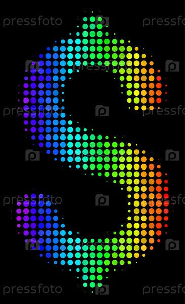 Пиксель впечатляющий полутонный доллар икона с использованием цветных тонов радуги с горизонтальным градиентом на черном фоне. Цветной векторный рисунок пиктограммы доллара сделано из круговых точек
