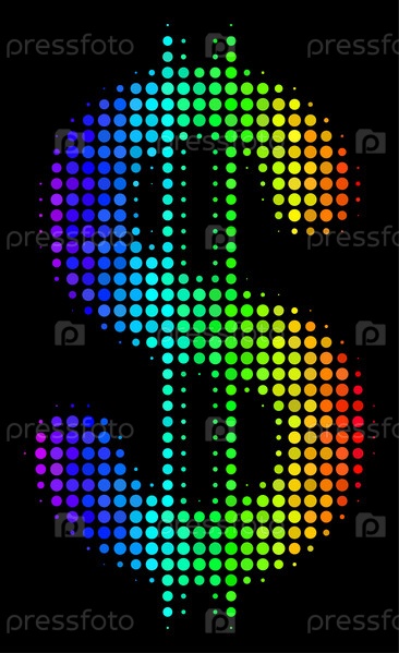 Икона доллара с яркой точкой полутонна, нарисованная спектральными цветовыми оттенками с горизонтальным градиентом на черном фоне. Яркий векторный коллаж символа доллара, разработанный из круговых частиц