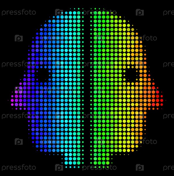 Пиксельные впечатляющие полутонные иконы с двойным лицом, нарисованные цветовыми оттенками спектра с горизонтальным градиентом на черном фоне.Красивый векторный рисунок иллюстрации с двумя лицами, состоящий из круговых точек