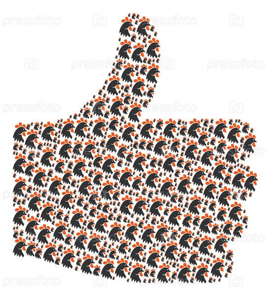 Примите коллаж, построенный из компонентов головы петуха в разных размерах. Абстрактная векторная иллюстрация пальцем вверх. Иконы головы петуха сгруппированы в хорошую форму знака