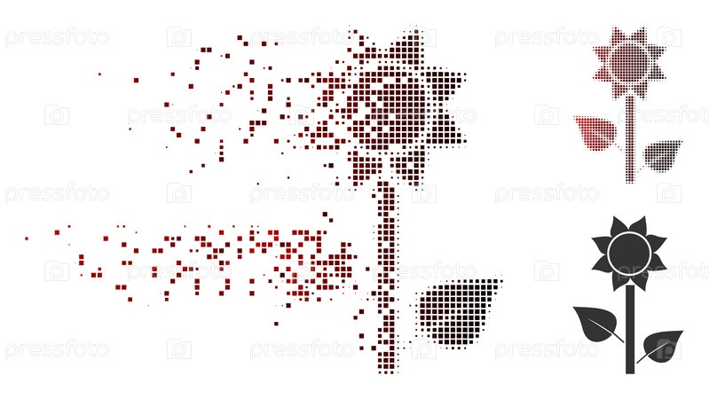 Векторная икона растения подсолнечника в блеске, пикселированный полутон и не поврежденные целые версии. эффект исчезания использует прямоугольные частицы и горизонтальный градиент от красного к черному